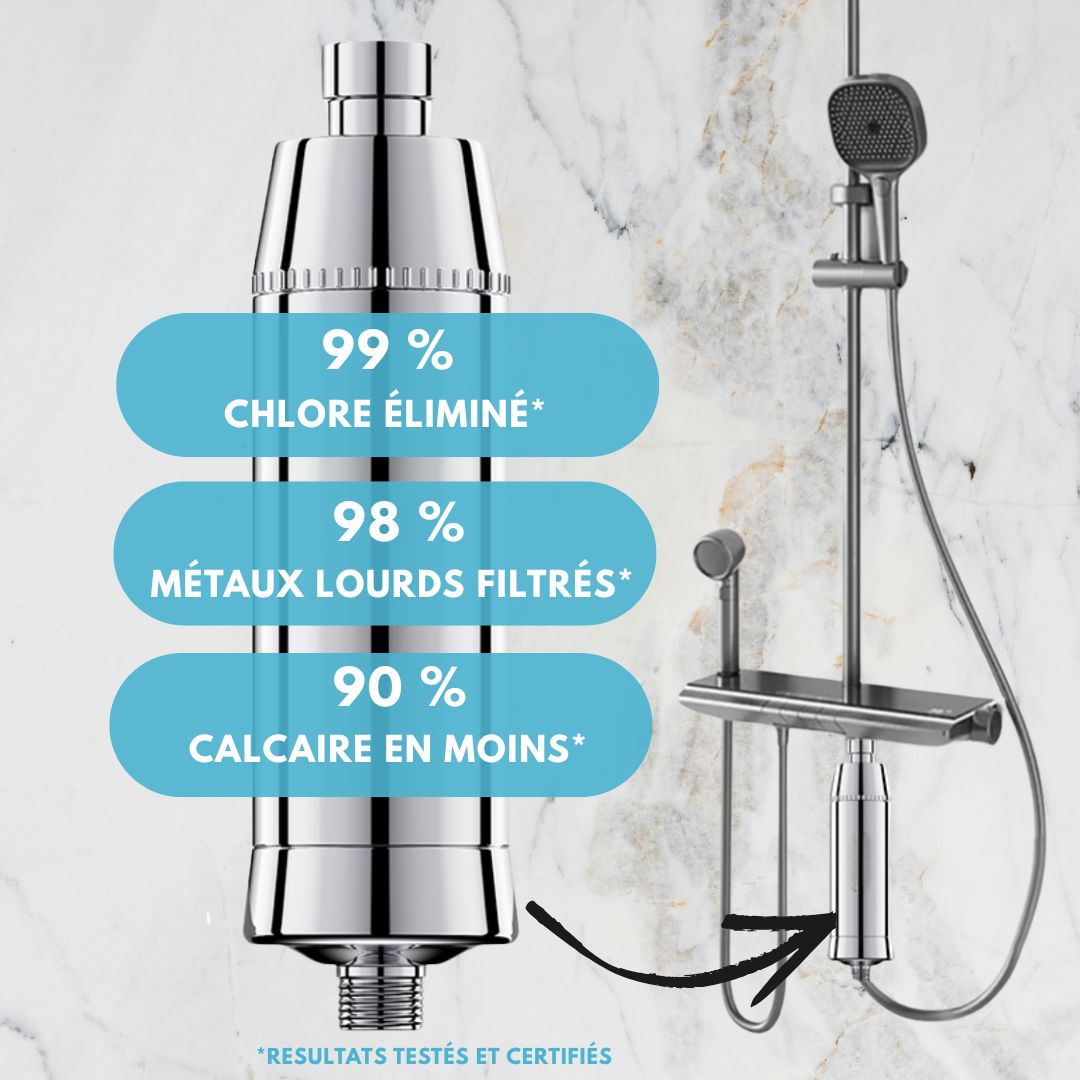 Le filtre élimine les substances agressives comme le chlore et les métaux lourds qui assèchent la peau, rendent les cheveux ternes et cassants, et laissant place aux ezemas et autres problemes.