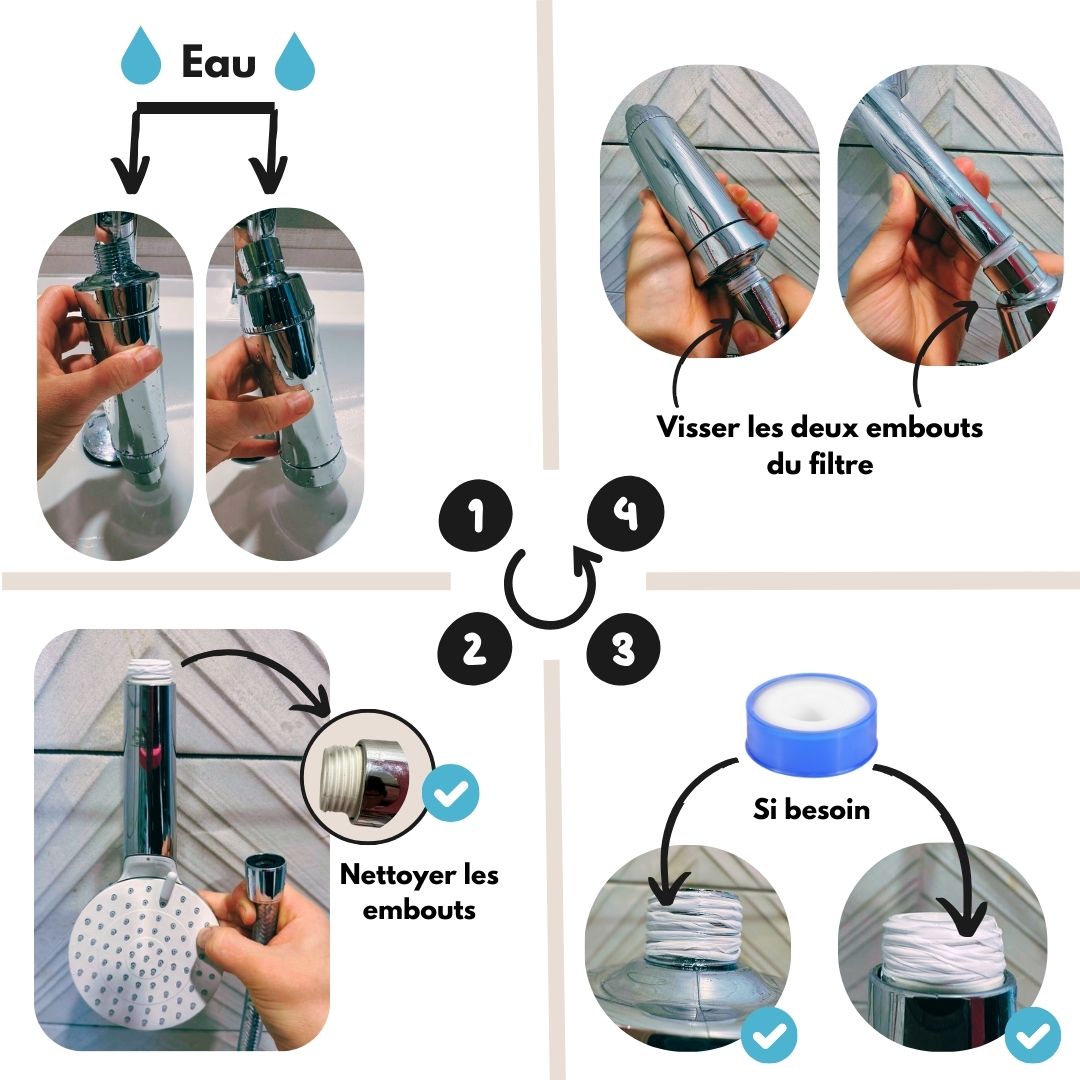 Si nécessaire, enroulez fermement le ruban Téflon autour des filetages du filtre et bras de douche/raccord de robinet, 5 à 8 tours suffisent !